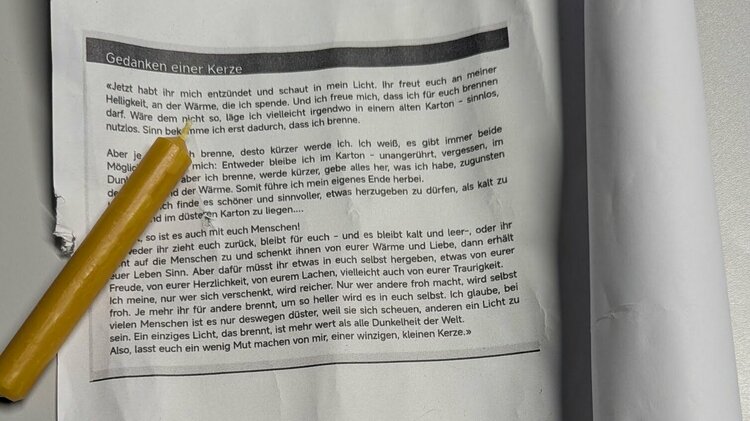 “Gedanken einer Kerze”. So lautet das schöne poetische Werk auf dem Zettel. Es ist von dem Theologen Adalbert Ludwig Balling. Und dieses kleine philosophische Essay ist wirklich “deep”.