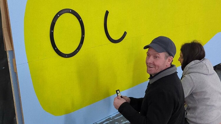 Auf den Holzwänden wurde jeweils ein gelbes U-Boot gemalt. Daran sind Holzringe befestigt. Was es damit auf sich hat, bleibt eine Überraschung.