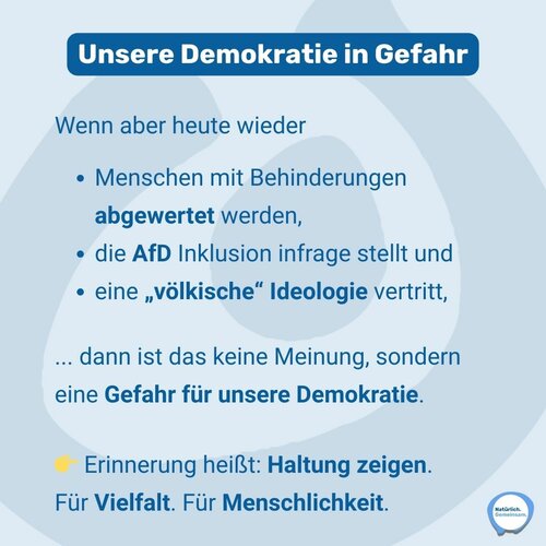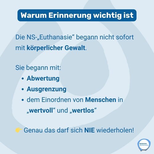 Diese Geschichte mahnt: Auch die NS-„Euthanasie“ begann nicht sofort mit physischer Gewalt. Es begann mit Abwertung, mit Ausgrenzung und der barbarischen Einordnung in „wertvoll“ und „wertlos“. Menschenrechte sind unteilbar – sie gelten für alle Menschen, unabhängig von Behinderung, Herkunft oder Lebensweise.