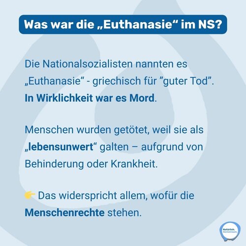 Die Nationalsozialisten bezeichneten die systematische Ermordung von Menschen mit Behinderungen zynisch als „Euthanasie“ - griechisch für “guter Tod”. In Wahrheit handelte es sich um Mord. Menschen wurden getötet, weil sie aufgrund einer Behinderung oder Erkrankung als „lebensunwert“ galten und nicht in das nationalsozialistische Weltbild passten.